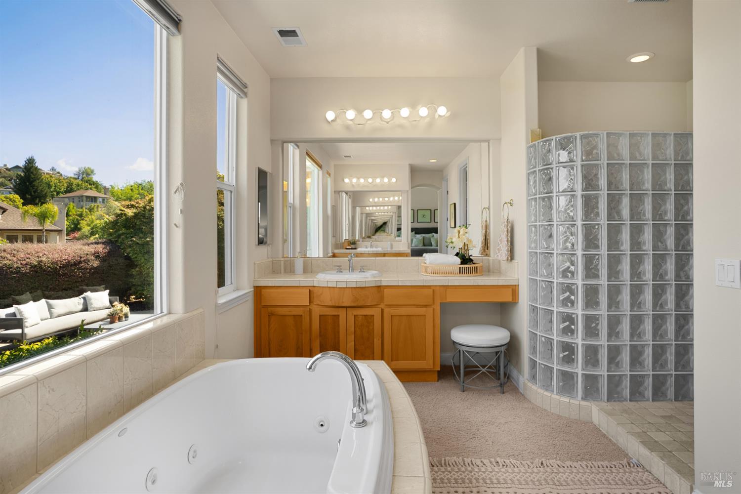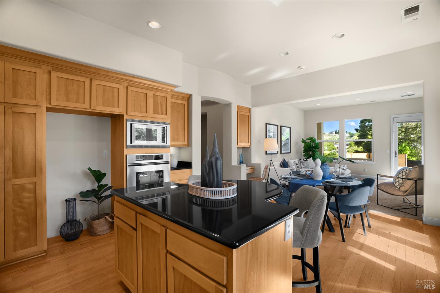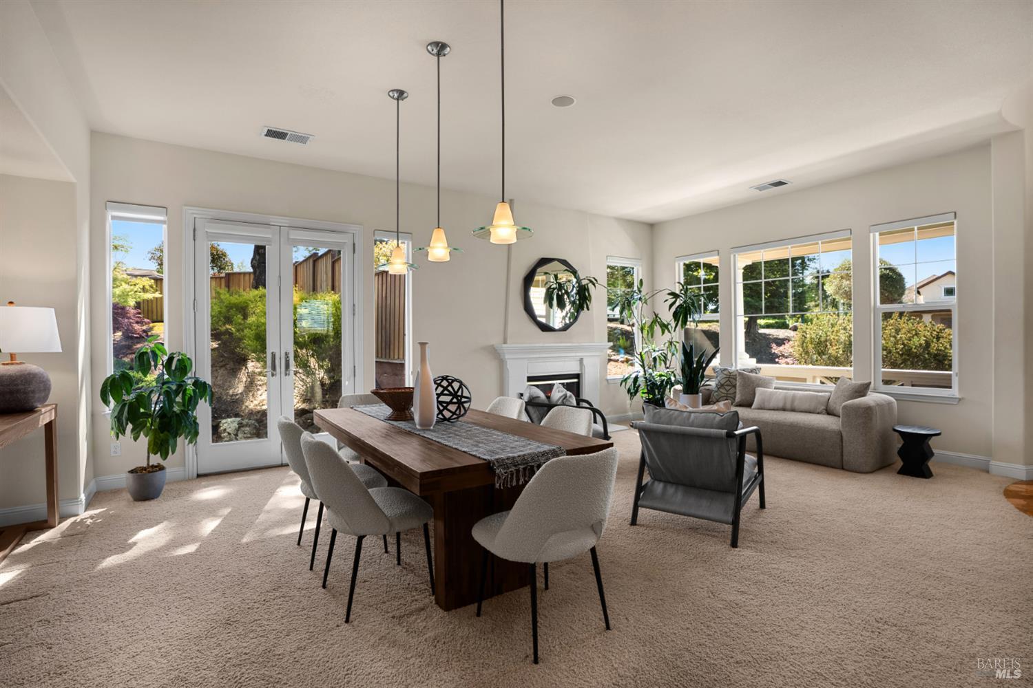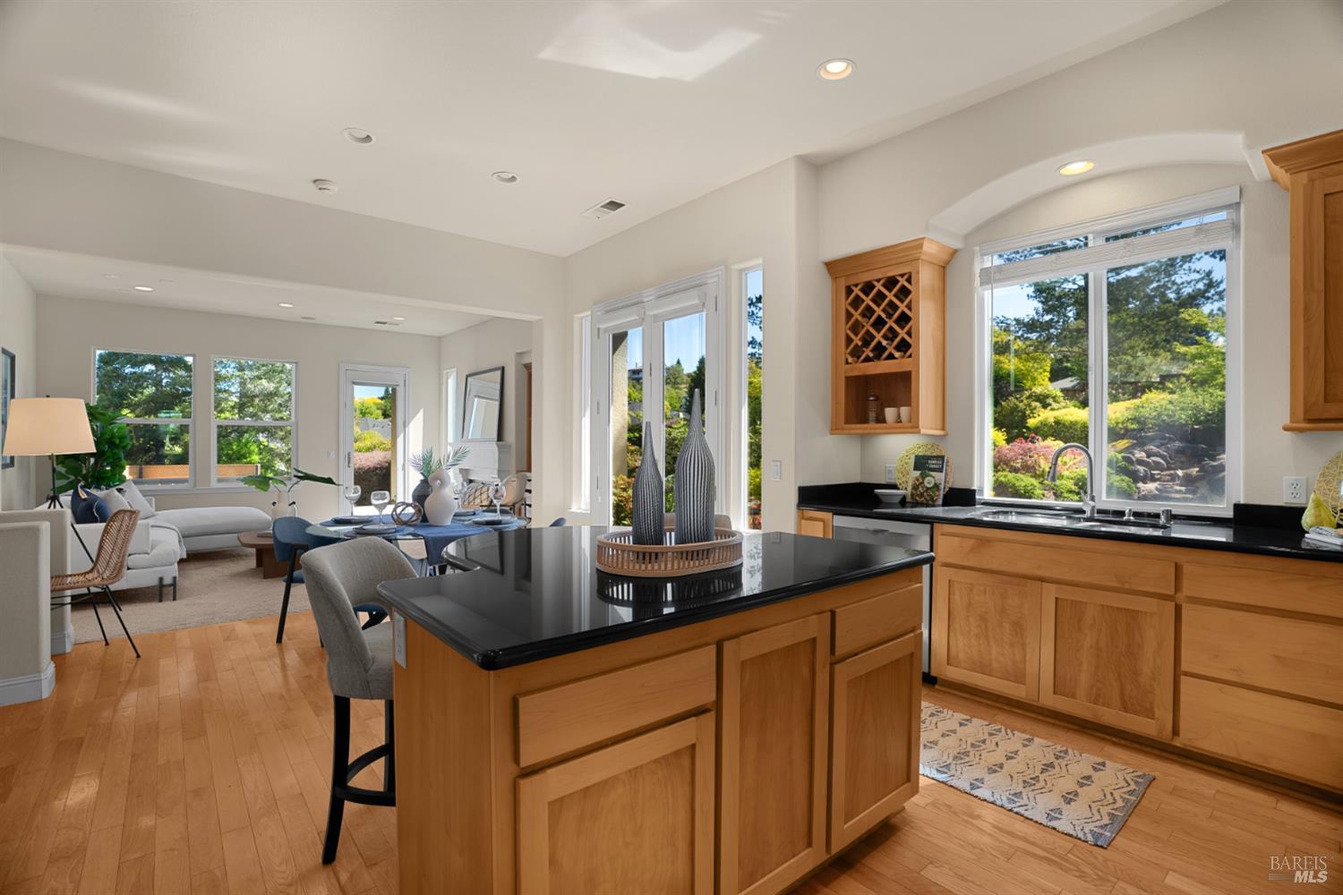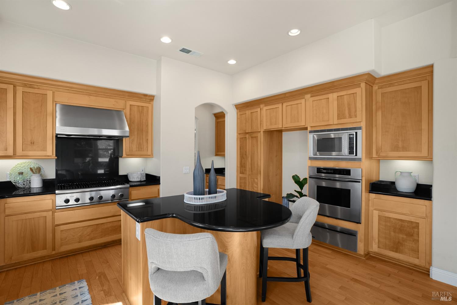 Located in this desirable Fountaingrove neighborhood, the home offers a rare single-level retreat on a private half-acre cul-de-sac lot backing to open space. Surrounded by mature landscaping, this property delivers exceptional privacy and seamless indoor-outdoor living. The thoughtfully designed floor plan includes 3 bedrooms plus a dedicated office with glass doors. The spacious primary suite features crown molding, French doors to the backyard, a walk-in closet, dual vanities, a soaking tub, and a separate shower. A front ensuite bedroom is ideal for guests, while a secondary bedroom connects to a Jack-and-Jill bath. The well-appointed kitchen is equipped with a 6-burner Thermador gas cooktop, professional hood with heat lamps, built-in oven, and microwave. Shaker alder/birch cabinetry, stone slab countertops, under-cabinet lighting, wood flooring, and a bright breakfast nook with French doors to the patio complete the space. Designed for both entertaining and everyday comfort, the home offers formal living and family rooms with gas-start fireplaces, a dining area with butler's pantry, and multiple French doors opening to the patio and yard. Additional features include a hot tub, laundry room with sink and cabinetry. A rare opportunity to enjoy privacy, space, and tranquility in Fountaingrove.