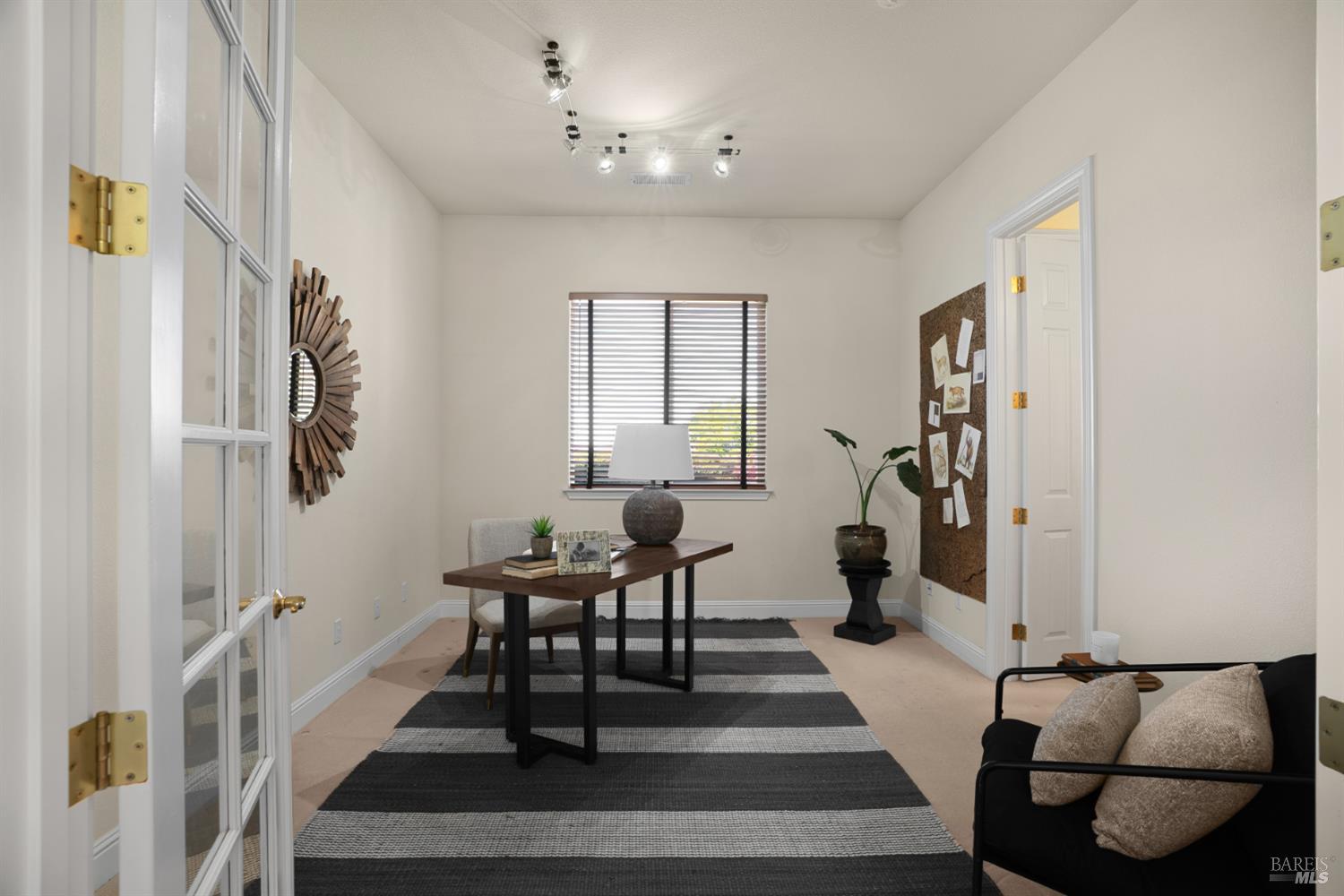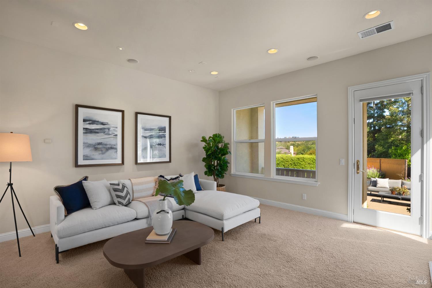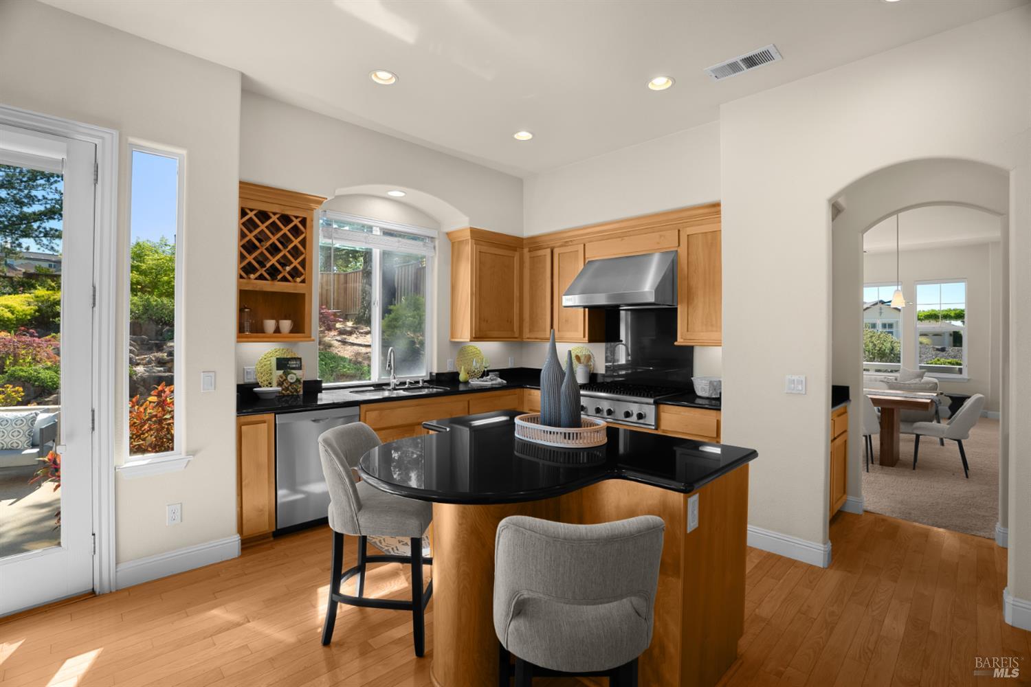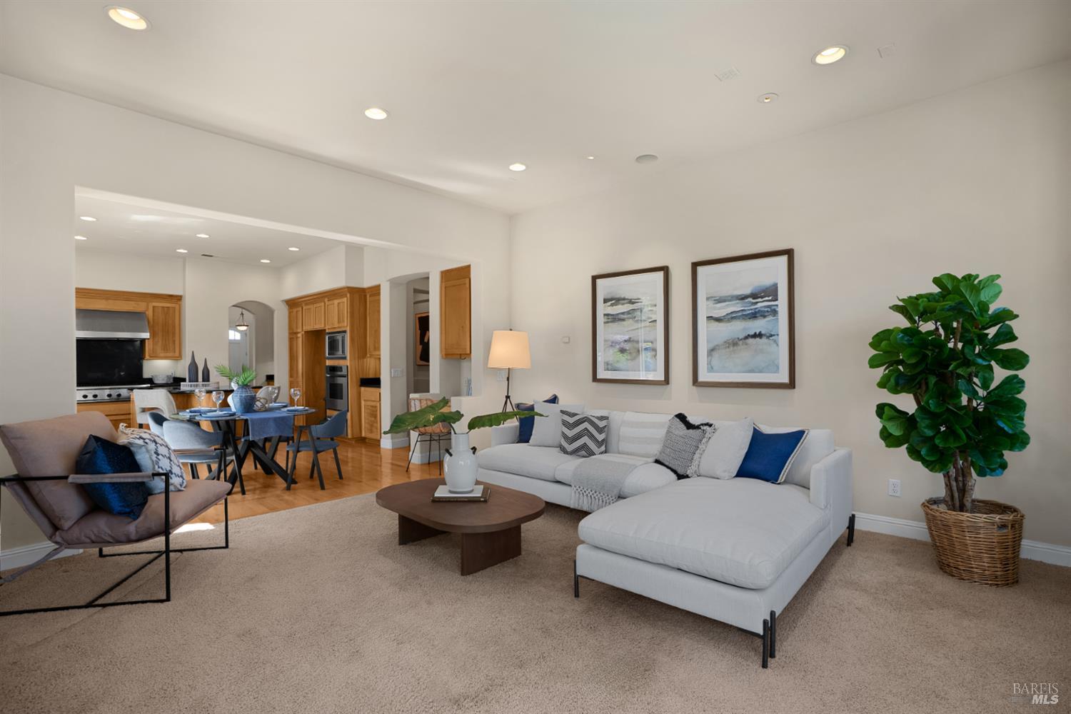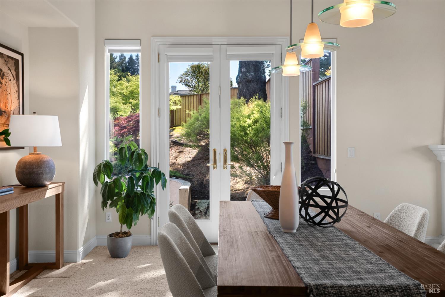 Located in this desirable Fountaingrove neighborhood, the home offers a rare single-level retreat on a private half-acre cul-de-sac lot backing to open space. Surrounded by mature landscaping, this property delivers exceptional privacy and seamless indoor-outdoor living. The thoughtfully designed floor plan includes 3 bedrooms plus a dedicated office with glass doors. The spacious primary suite features crown molding, French doors to the backyard, a walk-in closet, dual vanities, a soaking tub, and a separate shower. A front ensuite bedroom is ideal for guests, while a secondary bedroom connects to a Jack-and-Jill bath. The well-appointed kitchen is equipped with a 6-burner Thermador gas cooktop, professional hood with heat lamps, built-in oven, and microwave. Shaker alder/birch cabinetry, stone slab countertops, under-cabinet lighting, wood flooring, and a bright breakfast nook with French doors to the patio complete the space. Designed for both entertaining and everyday comfort, the home offers formal living and family rooms with gas-start fireplaces, a dining area with butler's pantry, and multiple French doors opening to the patio and yard. Additional features include a hot tub, laundry room with sink and cabinetry. A rare opportunity to enjoy privacy, space, and tranquility in Fountaingrove.