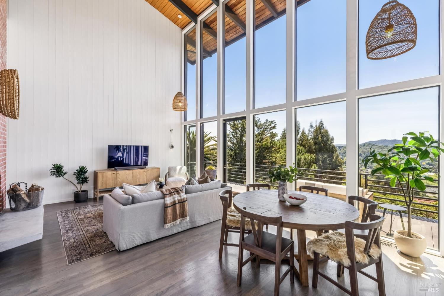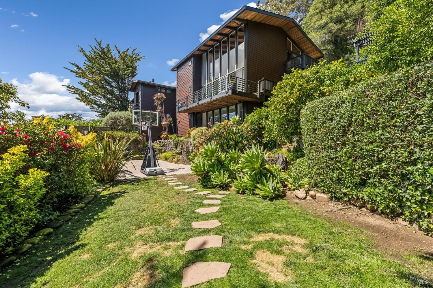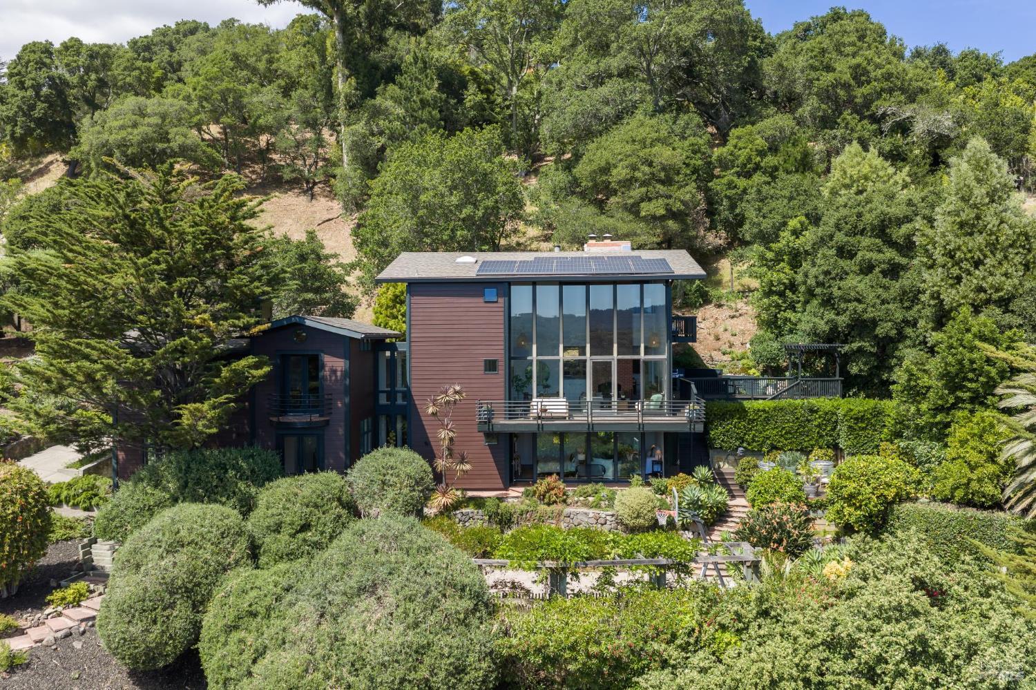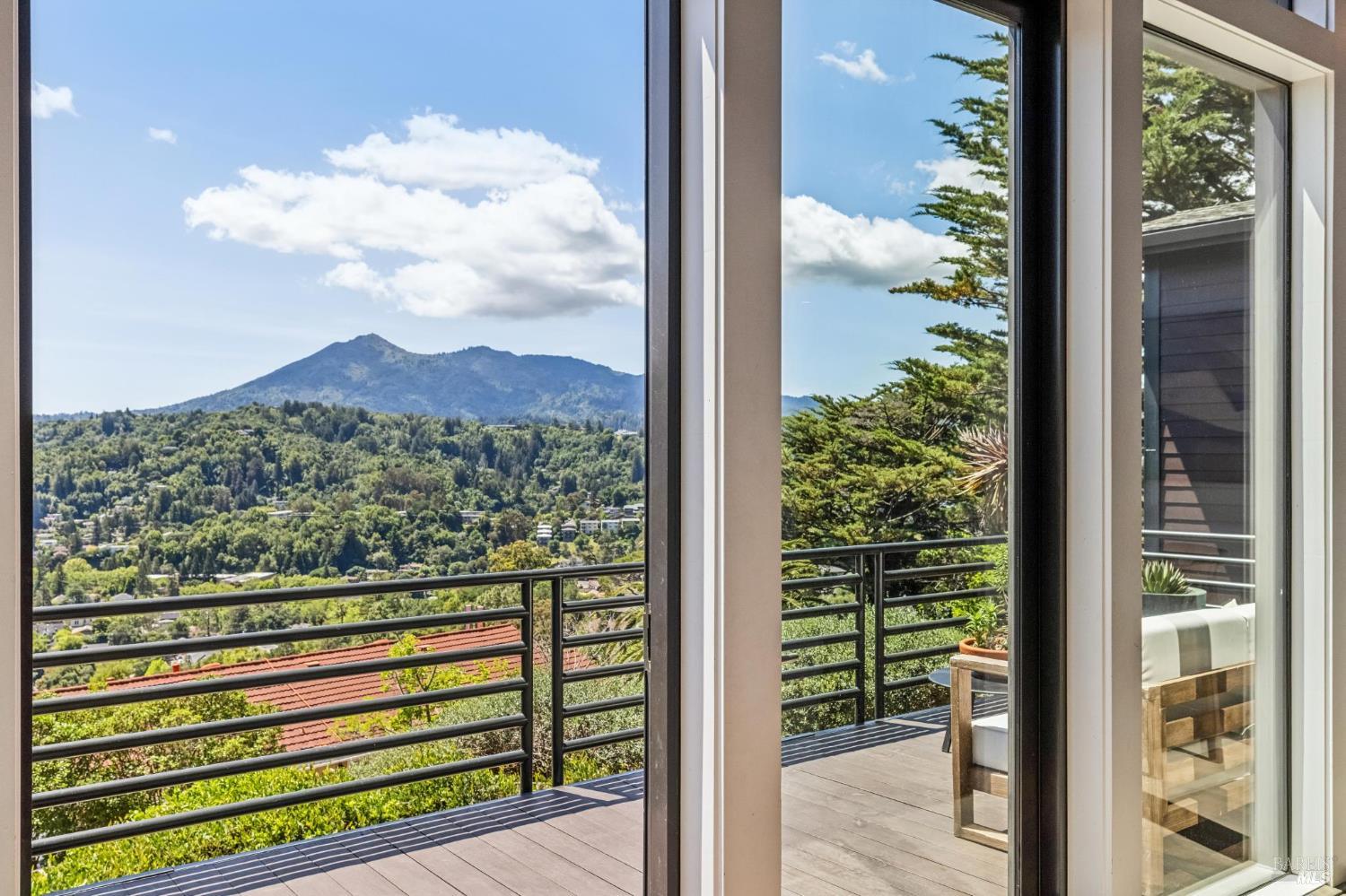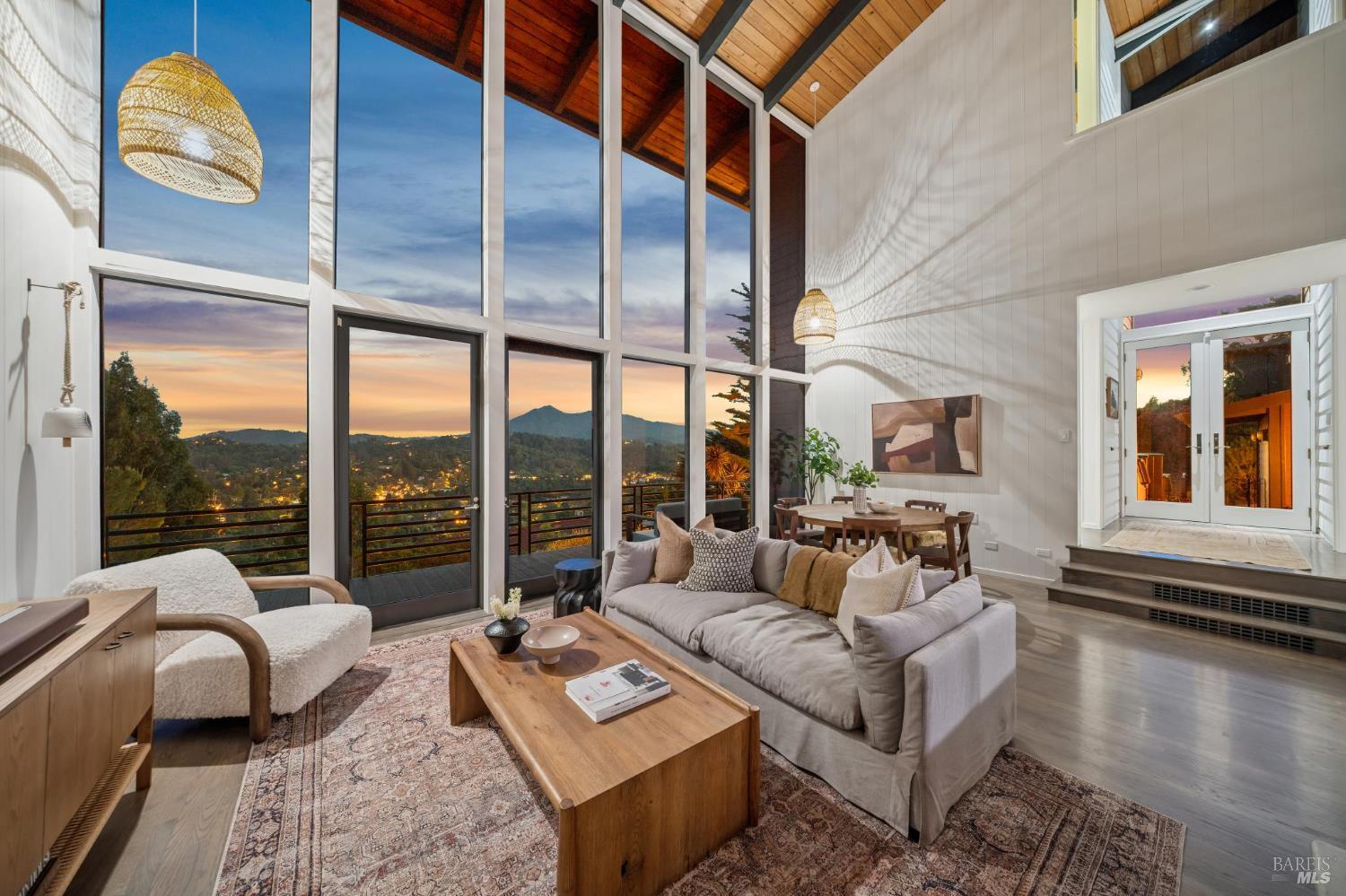 Welcome to 312 Fairhills Drive, an architecturally significant contemporary residence that balances modern design within the prestigious Fairhills neighborhood. This home features an airy living room with soaring two-story beamed ceilings and a towering fireplace that serve as the heart of the home, while the mature landscaping offers privacy and an exceptional California coastal retreat feel. The south-facing orientation ensures the interior is washed in natural light throughout the day, maximizing spectacular panoramic views from Mt. Tamalpais to the city. Inside, the home emphasizes a sense of volume and texture with hardwood floors and clean modern lines. The updated kitchen is designed for both daily use and entertaining, flowing seamlessly into the first of two family rooms where the indoor-outdoor flow is effortless and the connection to the scenery is constant. The layout is highly functional, featuring five bedrooms plus a bonus room and three and a half baths. Ample unique space throughout provide versatility for modern living, offering plenty of room for work, play, or relaxation in tucked-away, quiet corners. The primary suite serves as a private sanctuary, complete with a romantic fireplace and a deck overlooking the rolling hills. Downstairs, a flexible living space with its own separate entrance offers a quiet area for a gym, studio, playroom, or guest suite away from the main living quarters. Throughout the residence, windows frame the landscape, creating a gallery-like feel and drawing the beauty of the gardens inside. The grounds continue the theme of seclusion with lush gardens and a level lawn. You can spend time on the sun-drenched decks or in the spa, all positioned to take advantage of the southern exposure and sweeping views. While this sanctuary feels completely private, it is conveniently located near scenic hiking trails and the vibrant shopping, dining, and entertainment of downtown San Rafael. The home also offers an ideal location for easy access to major commute destinations and community events, providing a rare combination of modern architecture and functional space in a private San Rafael setting. Welcome Home!