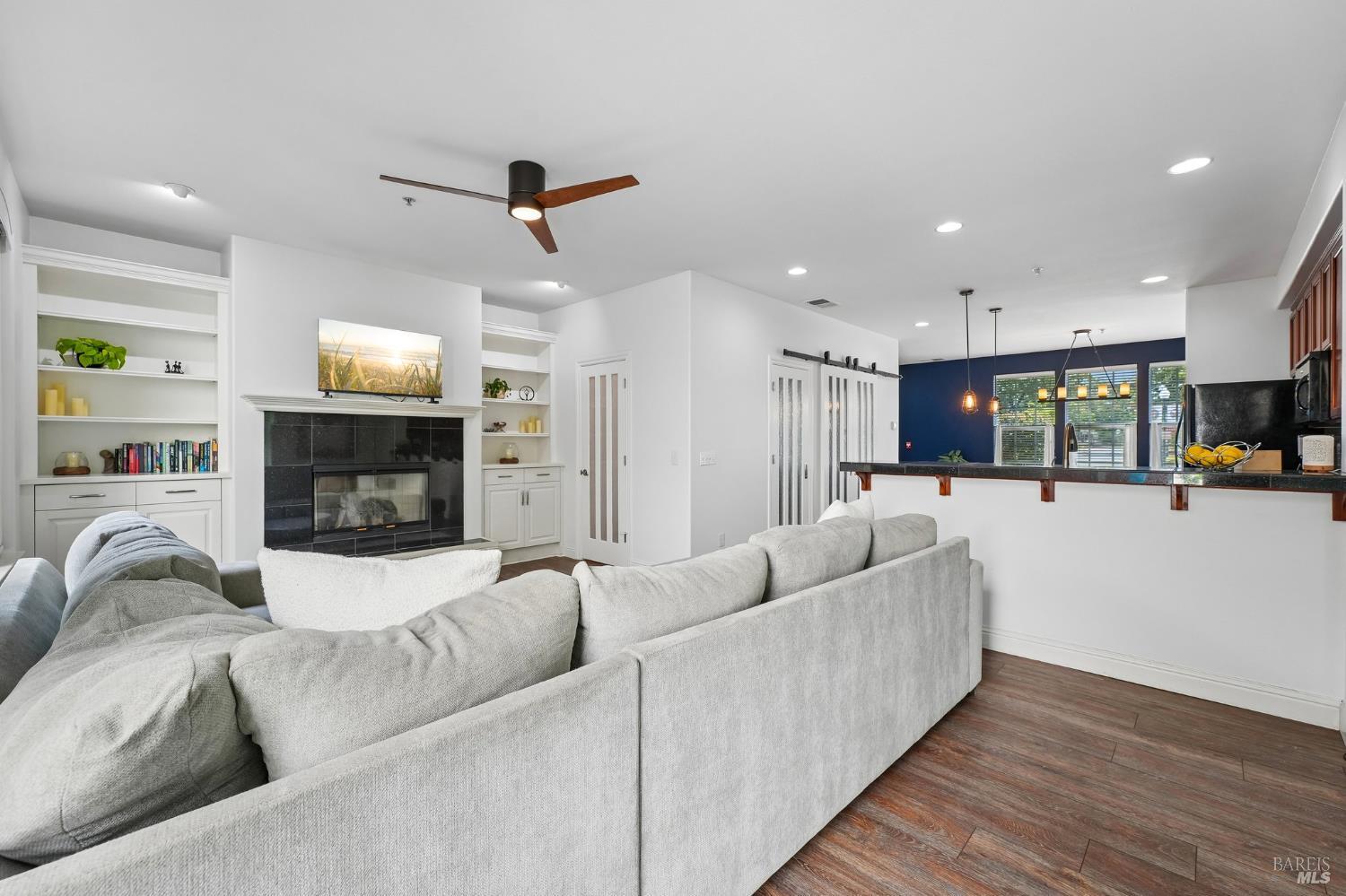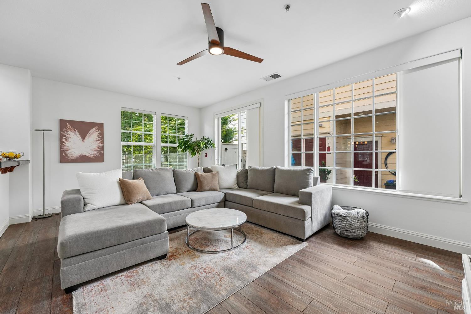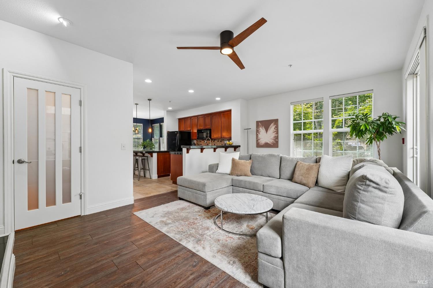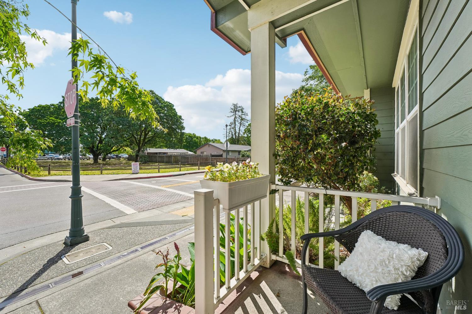 Located near Windsor's Town Green, this end-unit condo stands out for its layout, natural light, and especially appealing location. Set away from the busiest part of downtown, it offers a more tucked-away feel while still keeping restaurants, community events, the farmers market, and SMART train access close at hand. With 1,611+/- square feet, 3 bedrooms, 2.5 baths, a two-level floor plan, and a side-by-side 2-car garage, the home offers the comfort and function many buyers want but do not always find in condo living. The main level is open and inviting, with high ceilings, modern lighting, a gas fireplace, and a half bath off the great room. The kitchen opens directly to the living space and private courtyard patio, creating an easy flow for both everyday living and entertaining. Upstairs, the bedroom layout is practical and well separated, with a spacious primary suite that includes built-in storage, plus the added convenience of an upstairs laundry area. The private walk-up entry gives the home a more independent feel, and the end-unit placement adds to its overall appeal. HOA dues are $658 per month and include insurance on the structure, exterior and roof maintenance, common area and grounds maintenance, and professional management. For buyers looking for low-maintenance living on the Town Green without giving up space, light, or location, this home is truly set apart. The most compelling opportunity in downtown Windsor!