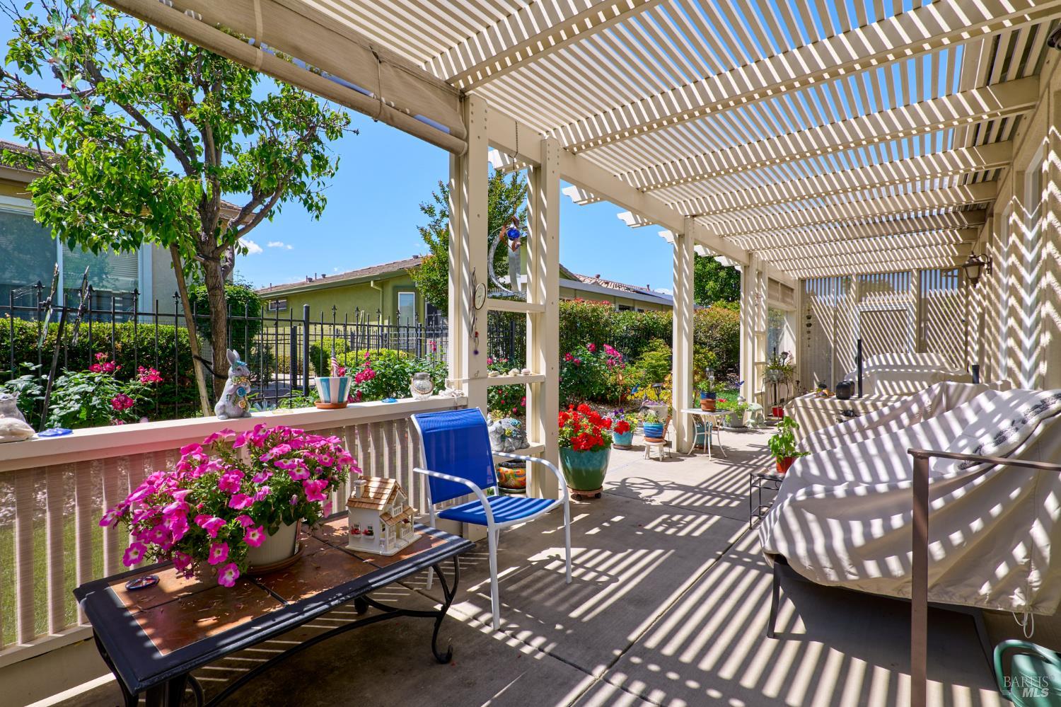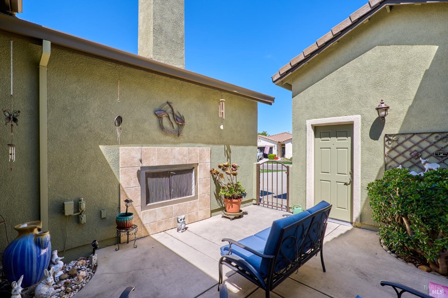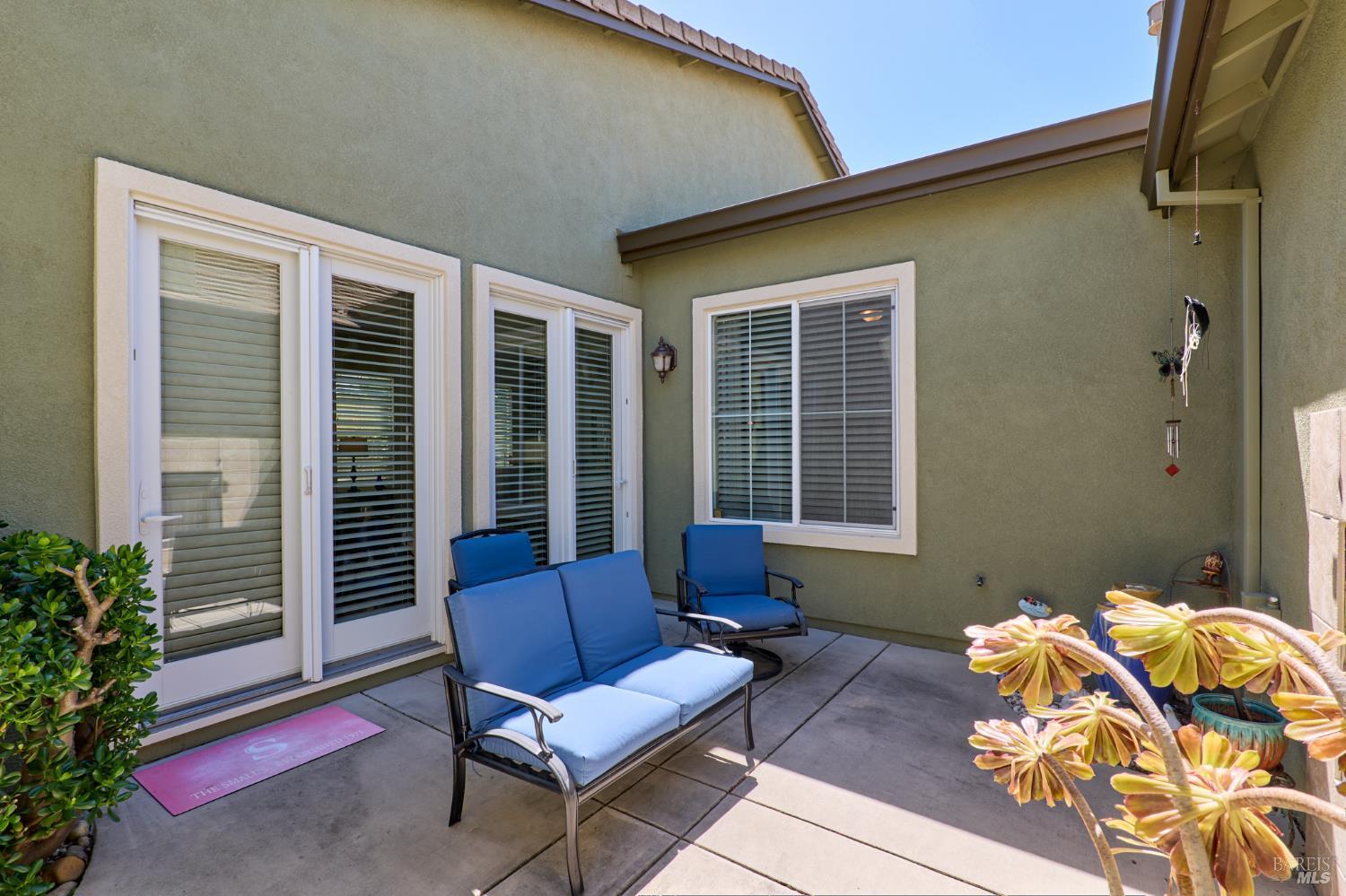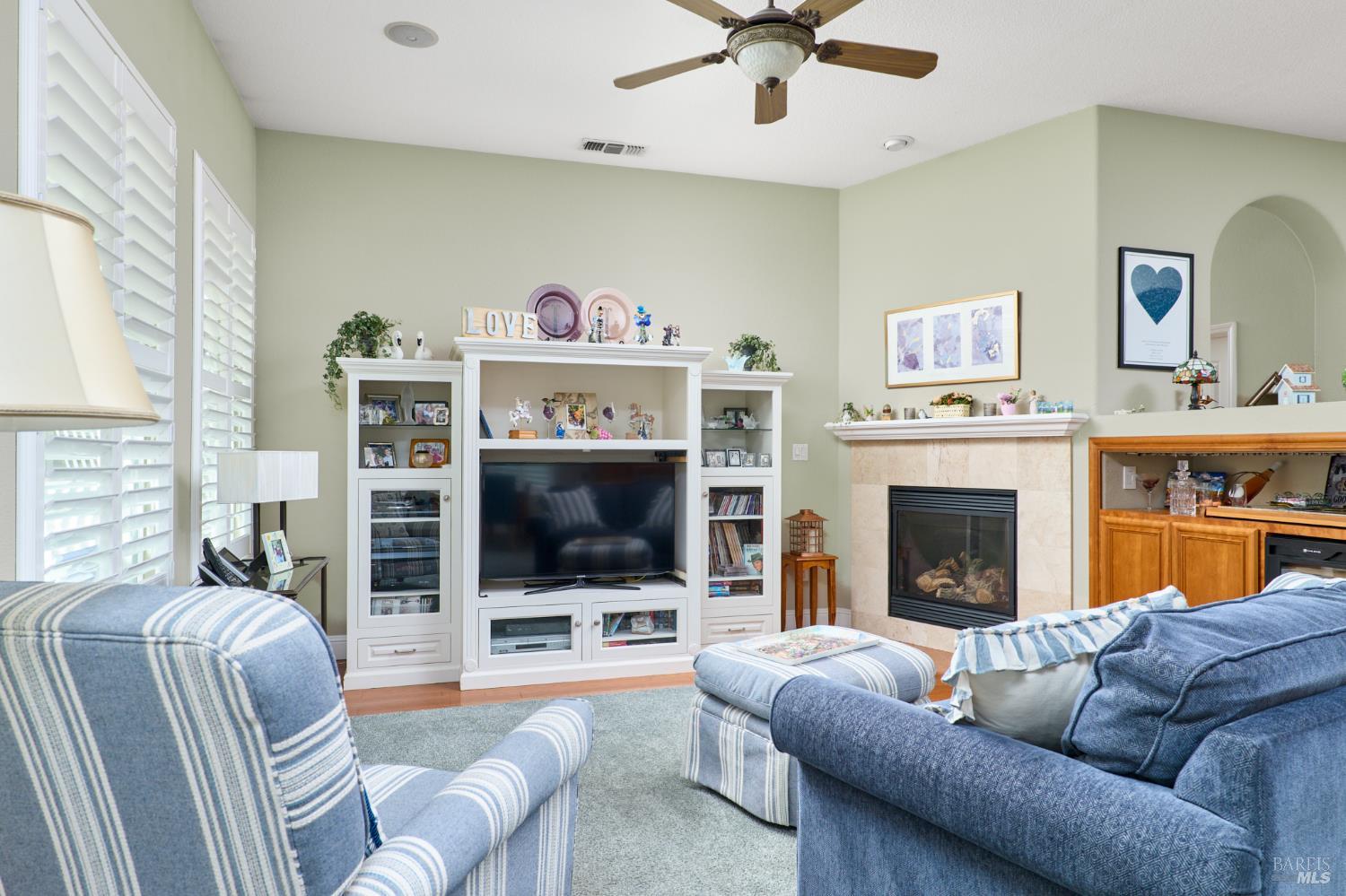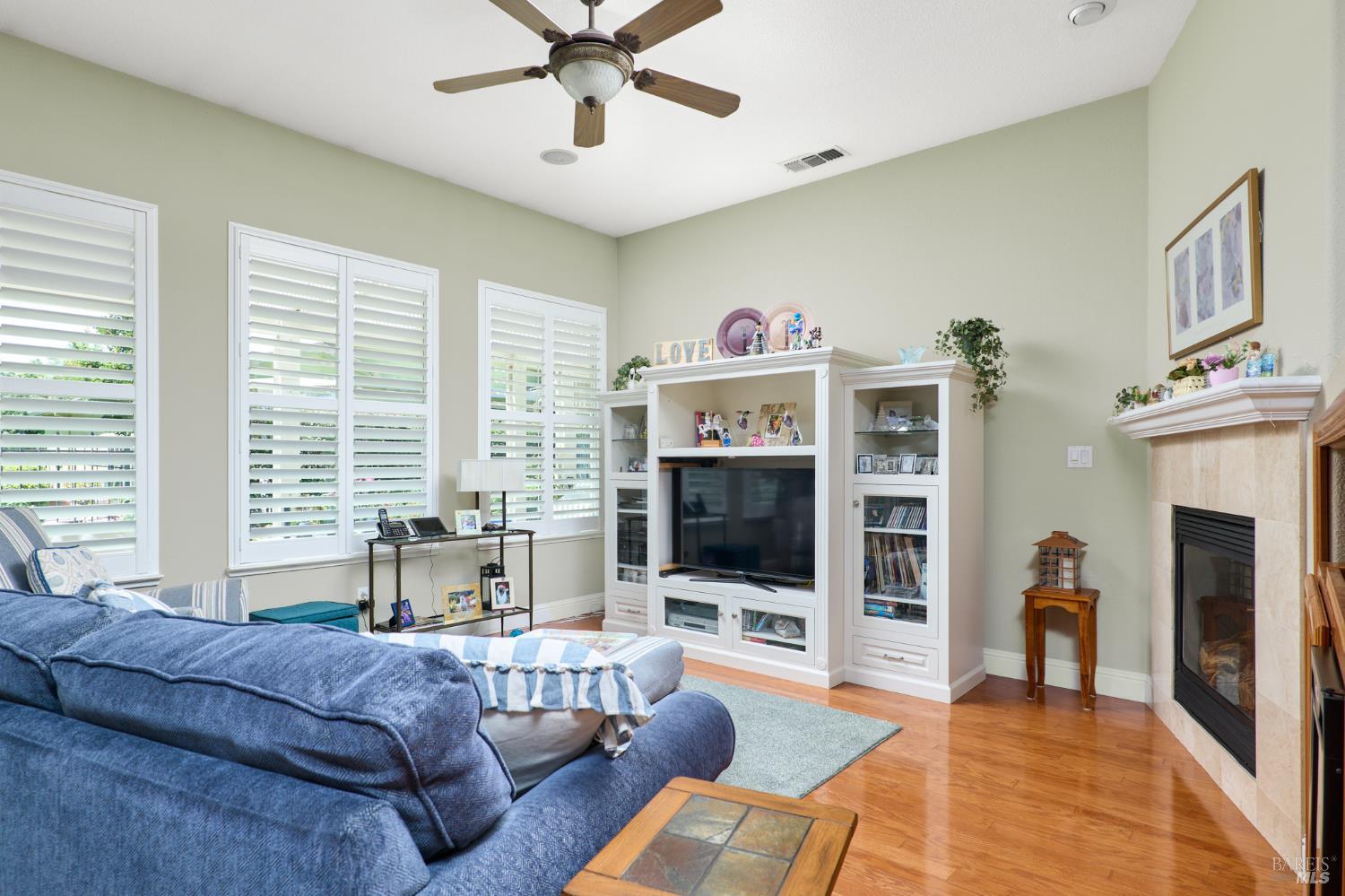 Walking this neighborhood for several years, one would enjoy the beautiful landscape and effort this seller has put into their yard. With curb appeal all the way to the back fence, this home is a showplace! The use of color from the walls to the warm wood floors through most of the home will bring a smile to your face. This is the Asti plan done the way it should be! After marveling at the beautiful yard, you will enter through the custom glass front door to the family and dining rooms with a wall of windows and doors viewing onto the courtyard with a custom wood burning fireplace. What a great place to sit and share a beverage. Off the dining room is an office/den with built in bookcases and views to courtyard. Now into the great room you will be greeted by granite counters, clear finish cherry cabinets, stainless appliances with true double ovens, an electric cooktop (pre-plumbed for gas), over the range type micro/hood and dishwasher. The unique island has a rounded end to it and the custom pendant lights follow that flow from above. The adjacent breakfast nook sits near rear patio doors with white shutters peaking out to the back yard where the rounded look is carried through to the patio hard surface. Another highlight are the two peak-a-boo windows under the cabinets. Across from the kitchen, the family room sits with wine/beverage bar, fireplace and room for your entertainment center. Meander down the hallway a bit and you will see the tech area with built in desk and then a half bath. Continue to the bedroom wing and to the left is the primary suite with spacious bedroom, a grand bathroom with 2 separate walk-in closets two vanities and a large soaking tub and separate shower. To the right is a secondary bedroom/bathroom suite before you come to the indoor laundry room. Yes, this home has a lot, including a 2 car and a 1 car garage, a large patio with an Alumawood type patio cover surrounded by stunning grounds! Trilogy at Rio Vista is a gated community built around an 18-hole golf course that weaves through the development. There are clubhouses, indoor and outdoor pools, BBQ areas, an indoor walking track, a gym and spa, many club rooms, tennis/pickleball courts bocce and so much more. There are about 100 clubs and groups to be involved with. HOA dues do not include golf play.