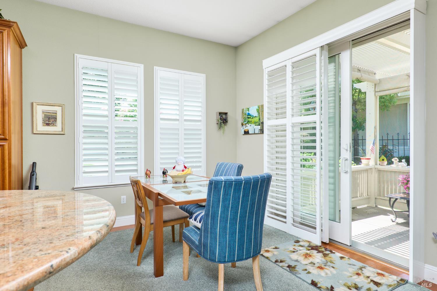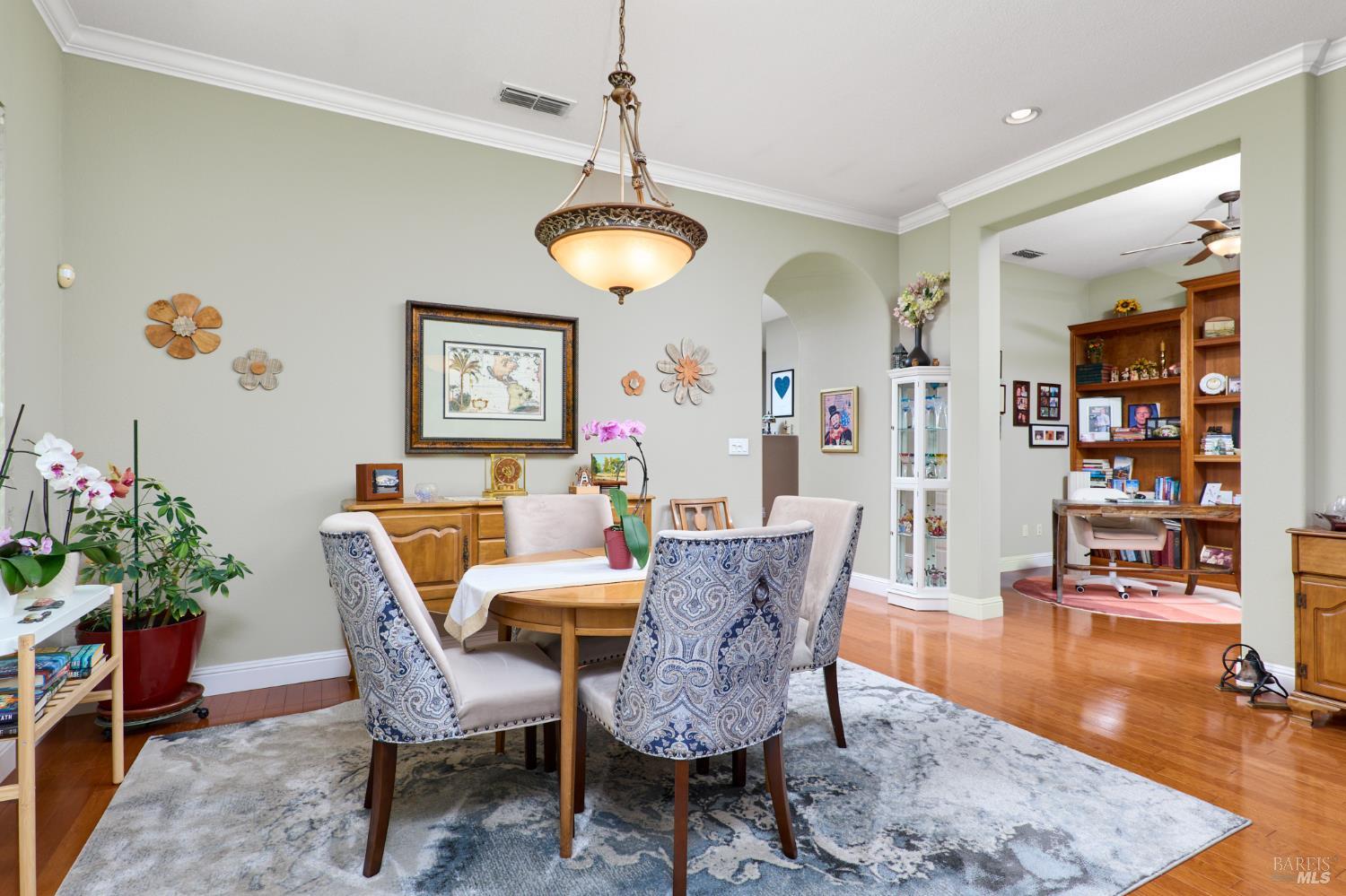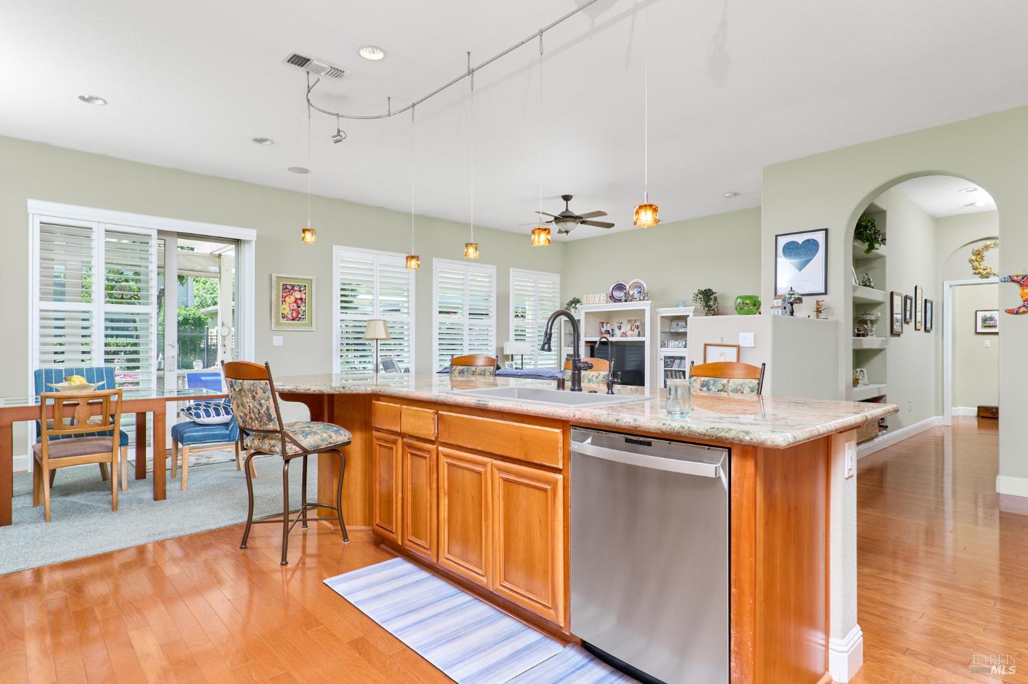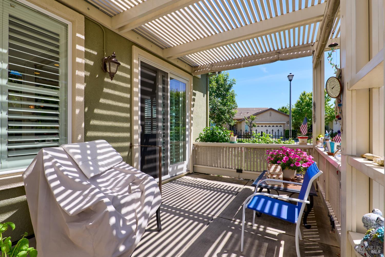 Walking this neighborhood for several years, one would enjoy the beautiful landscape and effort this seller has put into their yard. With curb appeal all the way to the back fence, this home is a showplace! The use of color from the walls to the warm wood floors through most of the home will bring a smile to your face. This is the Asti plan done the way it should be! After marveling at the beautiful yard, you will enter through the custom glass front door to the family and dining rooms with a wall of windows and doors viewing onto the courtyard with a custom wood burning fireplace. What a great place to sit and share a beverage. Off the dining room is an office/den with built in bookcases and views to courtyard. Now into the great room you will be greeted by granite counters, clear finish cherry cabinets, stainless appliances with true double ovens, an electric cooktop (pre-plumbed for gas), over the range type micro/hood and dishwasher. The unique island has a rounded end to it and the custom pendant lights follow that flow from above. The adjacent breakfast nook sits near rear patio doors with white shutters peaking out to the back yard where the rounded look is carried through to the patio hard surface. Another highlight are the two peak-a-boo windows under the cabinets. Across from the kitchen, the family room sits with wine/beverage bar, fireplace and room for your entertainment center. Meander down the hallway a bit and you will see the tech area with built in desk and then a half bath. Continue to the bedroom wing and to the left is the primary suite with spacious bedroom, a grand bathroom with 2 separate walk-in closets two vanities and a large soaking tub and separate shower. To the right is a secondary bedroom/bathroom suite before you come to the indoor laundry room. Yes, this home has a lot, including a 2 car and a 1 car garage, a large patio with an Alumawood type patio cover surrounded by stunning grounds! Trilogy at Rio Vista is a gated community built around an 18-hole golf course that weaves through the development. There are clubhouses, indoor and outdoor pools, BBQ areas, an indoor walking track, a gym and spa, many club rooms, tennis/pickleball courts bocce and so much more. There are about 100 clubs and groups to be involved with. HOA dues do not include golf play.