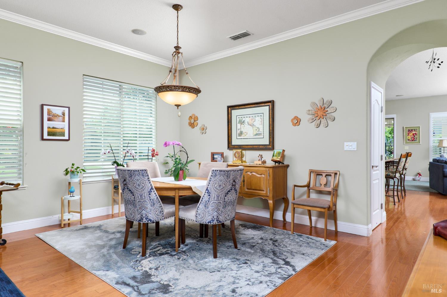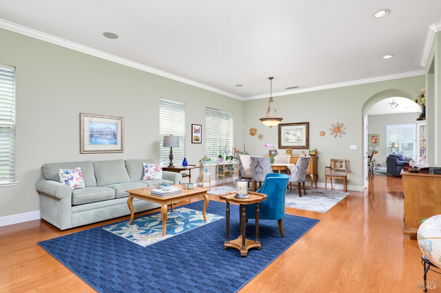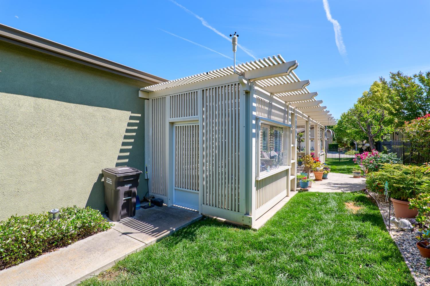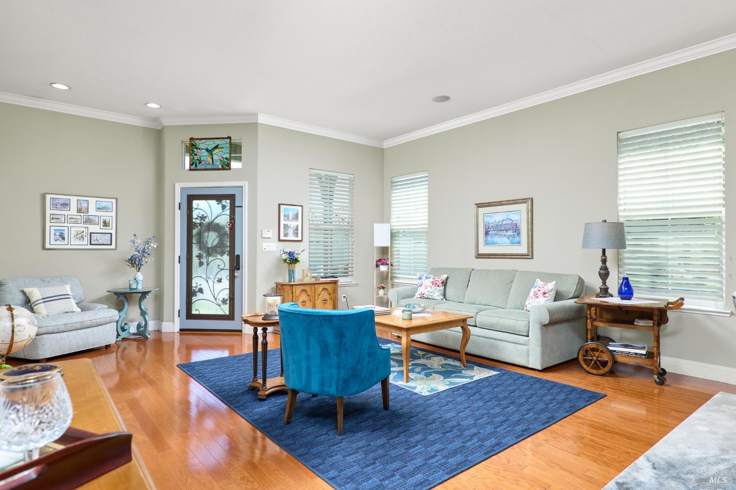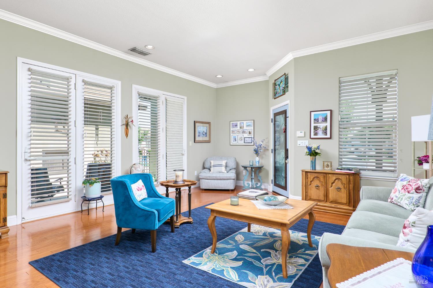 Walking this neighborhood for several years, one would enjoy the beautiful landscape and effort this seller has put into their yard. With curb appeal all the way to the back fence, this home is a showplace! The use of color from the walls to the warm wood floors through most of the home will bring a smile to your face. This is the Asti plan done the way it should be! After marveling at the beautiful yard, you will enter through the custom glass front door to the family and dining rooms with a wall of windows and doors viewing onto the courtyard with a custom wood burning fireplace. What a great place to sit and share a beverage. Off the dining room is an office/den with built in bookcases and views to courtyard. Now into the great room you will be greeted by granite counters, clear finish cherry cabinets, stainless appliances with true double ovens, an electric cooktop (pre-plumbed for gas), over the range type micro/hood and dishwasher. The unique island has a rounded end to it and the custom pendant lights follow that flow from above. The adjacent breakfast nook sits near rear patio doors with white shutters peaking out to the back yard where the rounded look is carried through to the patio hard surface. Another highlight are the two peak-a-boo windows under the cabinets. Across from the kitchen, the family room sits with wine/beverage bar, fireplace and room for your entertainment center. Meander down the hallway a bit and you will see the tech area with built in desk and then a half bath. Continue to the bedroom wing and to the left is the primary suite with spacious bedroom, a grand bathroom with 2 separate walk-in closets two vanities and a large soaking tub and separate shower. To the right is a secondary bedroom/bathroom suite before you come to the indoor laundry room. Yes, this home has a lot, including a 2 car and a 1 car garage, a large patio with an Alumawood type patio cover surrounded by stunning grounds! Trilogy at Rio Vista is a gated community built around an 18-hole golf course that weaves through the development. There are clubhouses, indoor and outdoor pools, BBQ areas, an indoor walking track, a gym and spa, many club rooms, tennis/pickleball courts bocce and so much more. There are about 100 clubs and groups to be involved with. HOA dues do not include golf play.