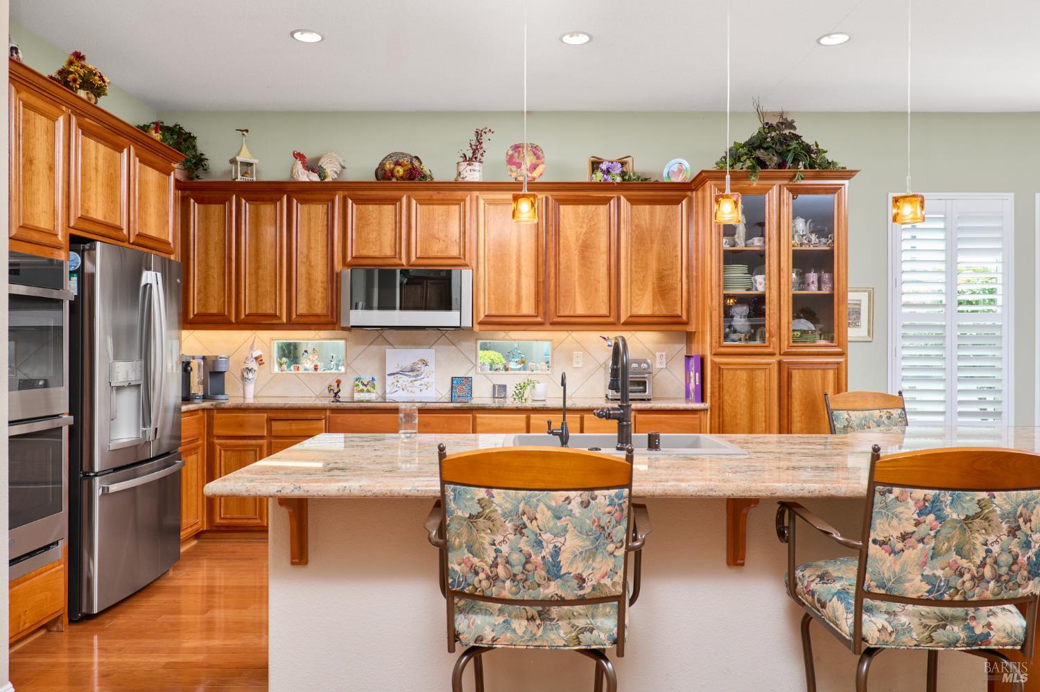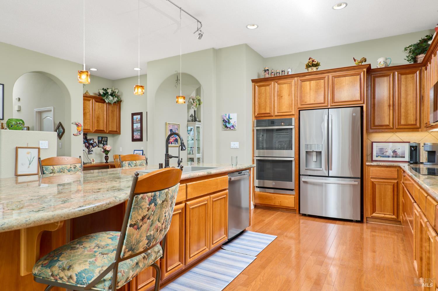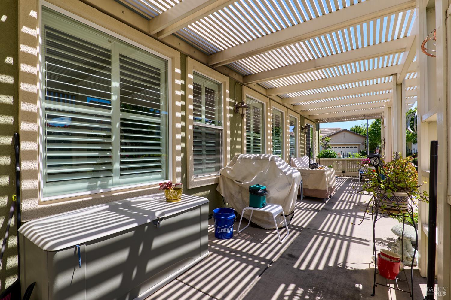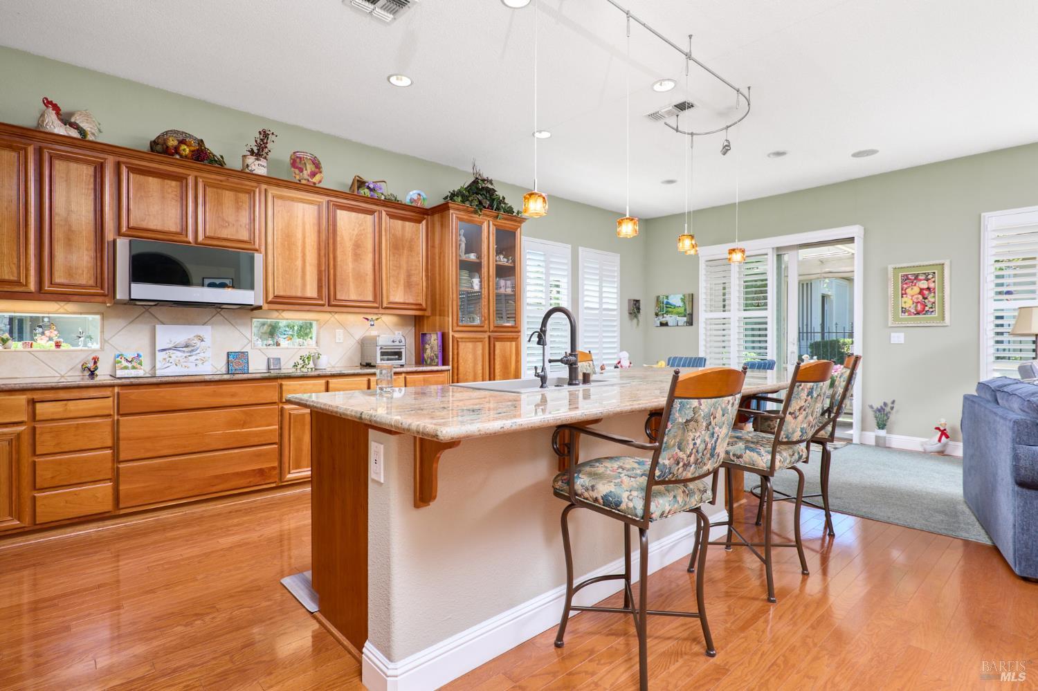 Walking this neighborhood for several years, one would enjoy the beautiful landscape and effort this seller has put into their yard. With curb appeal all the way to the back fence, this home is a showplace! The use of color from the walls to the warm wood floors through most of the home will bring a smile to your face. This is the Asti plan done the way it should be! After marveling at the beautiful yard, you will enter through the custom glass front door to the family and dining rooms with a wall of windows and doors viewing onto the courtyard with a custom wood burning fireplace. What a great place to sit and share a beverage. Off the dining room is an office/den with built in bookcases and views to courtyard. Now into the great room you will be greeted by granite counters, clear finish cherry cabinets, stainless appliances with true double ovens, an electric cooktop (pre-plumbed for gas), over the range type micro/hood and dishwasher. The unique island has a rounded end to it and the custom pendant lights follow that flow from above. The adjacent breakfast nook sits near rear patio doors with white shutters peaking out to the back yard where the rounded look is carried through to the patio hard surface. Another highlight are the two peak-a-boo windows under the cabinets. Across from the kitchen, the family room sits with wine/beverage bar, fireplace and room for your entertainment center. Meander down the hallway a bit and you will see the tech area with built in desk and then a half bath. Continue to the bedroom wing and to the left is the primary suite with spacious bedroom, a grand bathroom with 2 separate walk-in closets two vanities and a large soaking tub and separate shower. To the right is a secondary bedroom/bathroom suite before you come to the indoor laundry room. Yes, this home has a lot, including a 2 car and a 1 car garage, a large patio with an Alumawood type patio cover surrounded by stunning grounds! Trilogy at Rio Vista is a gated community built around an 18-hole golf course that weaves through the development. There are clubhouses, indoor and outdoor pools, BBQ areas, an indoor walking track, a gym and spa, many club rooms, tennis/pickleball courts bocce and so much more. There are about 100 clubs and groups to be involved with. HOA dues do not include golf play.