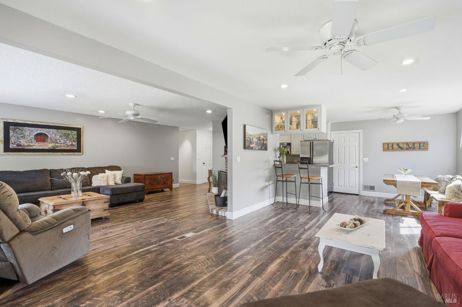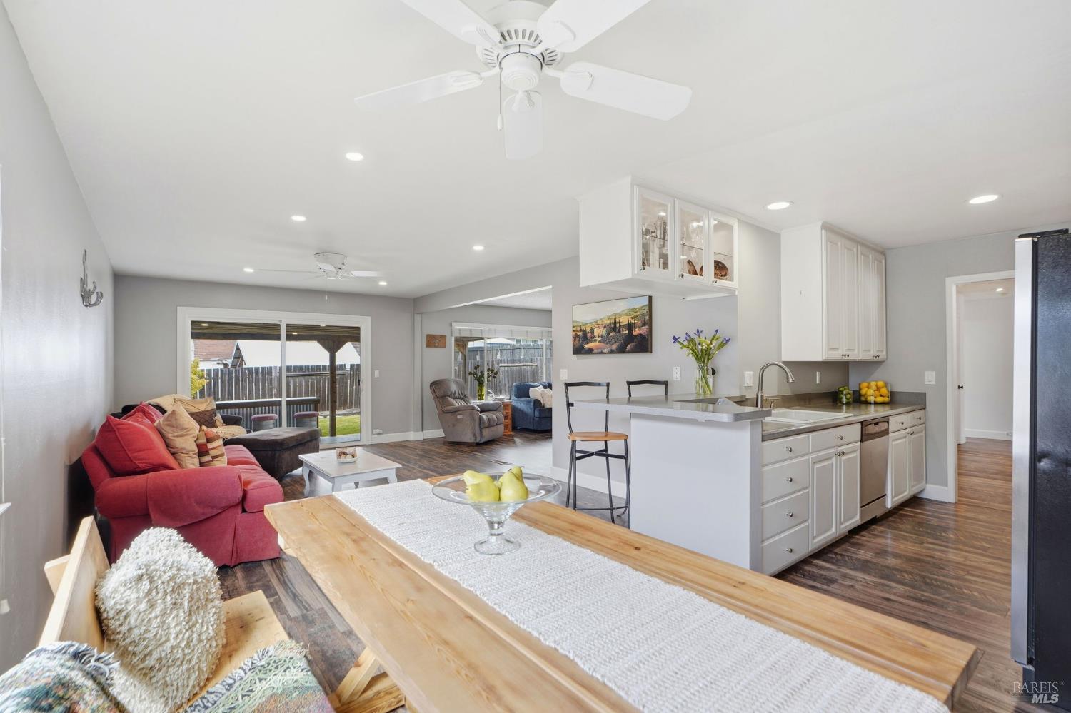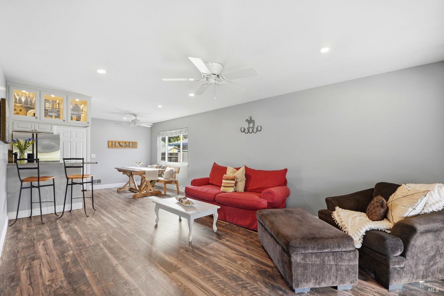 Welcome to this rarely available popular 4-bedroom 2-bath single level ranch home, located on a great street of an established neighborhood in East Novato. Updates to the home over the years include a new roof, dual paned windows, engineered flooring, electrical panel, electrical outlets & wall switches, recessed lighting, new interior doors with oiled bronze hardware, baseboards & trim, interior and exterior paint, window coverings, new water heater and updated kitchen & baths. The kitchen has a sizable workspace and a raised countertop with seating and opens to a casual dining area. The spacious family room can transition to a formal dining area and has a slider to the covered patio. The formal living room was opened up by removing a section of the wall to the family room/dining area to give an open feel and has an inviting brick fireplace. Out back you will find a level yard that has a covered outside bar area and is complete with a BBQ, rustic wood paneling on the ceiling and accent wall, a large seating area and a mounted television. A large lawn area in addition to a peaceful setting complete the area you will love. Large side yard with oversized gate allows for boat or trailer parking. 2-car garage. Close to Olive School, Trader Joe's, Starbucks, Whole Foods and Old Town Novato.