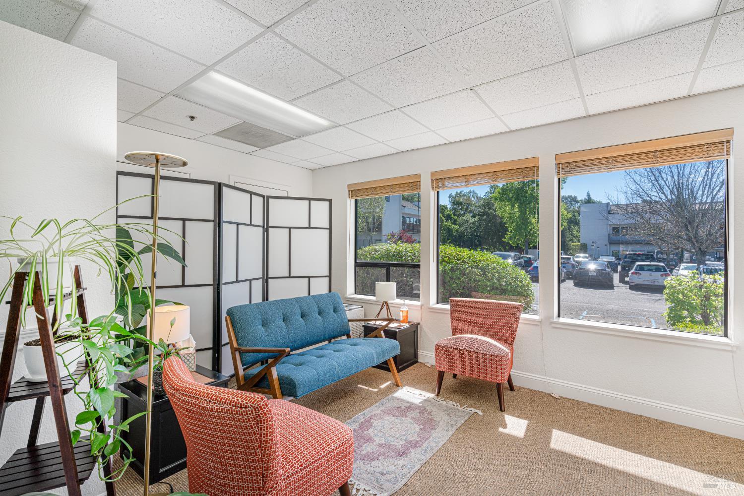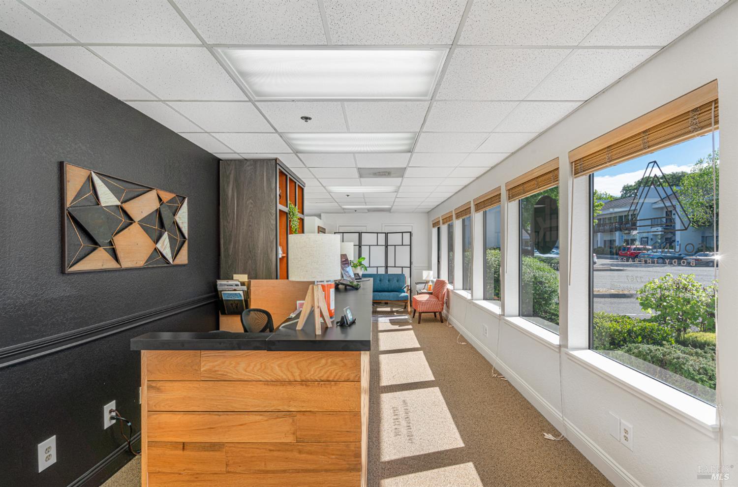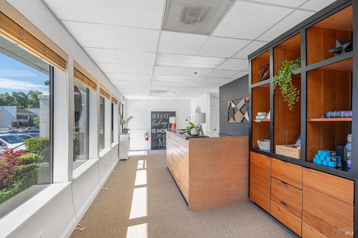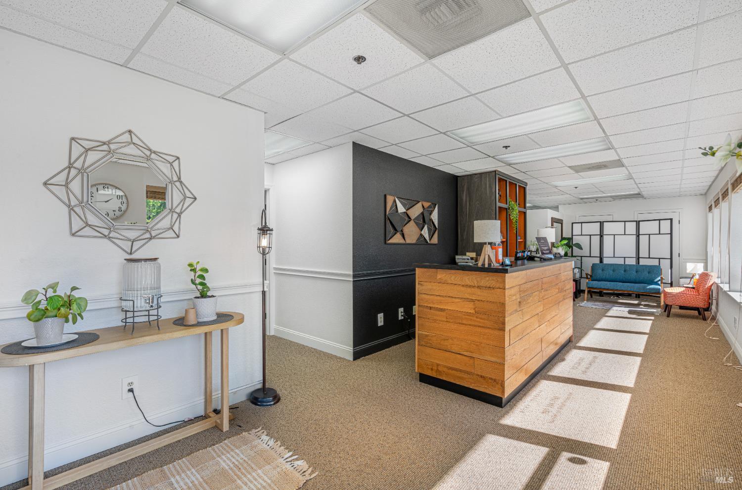 Well-designed and highly versatile commercial space offering a modern, turnkey buildout ideally suited for a wide variety of medical uses or professional office use. Located in the highly desirable Wikiup Professional / Larkfield corridor, the property benefits from a peaceful, professional setting with convenient access to Highway 101, Windsor, and the Sonoma County Airport area. The space features a welcoming reception area with a custom front desk, creating a polished first impression for clients and guests. Large windows line the perimeter, filling the interior with abundant natural light and enhancing the bright, open atmosphere throughout. The flexible floor plan includes a spacious open studio area, well-suited for fitness training and a variety of medical wellness-based uses. Additional features include three private rooms, two bathrooms, and a kitchenette, providing excellent functionality. Thoughtful finishes and an efficient layout make this a true turnkey opportunity for users seeking a professional, client-ready environment. The surrounding Wikiup business park is home to a mix of professional offices, medical and wellness practices, creating a strong, established commercial environment with consistent daytime activity and a well-balanced professional tenant base.
