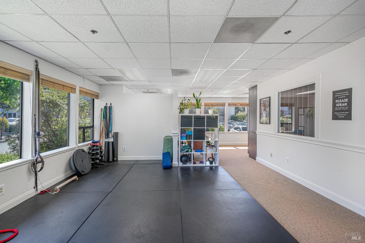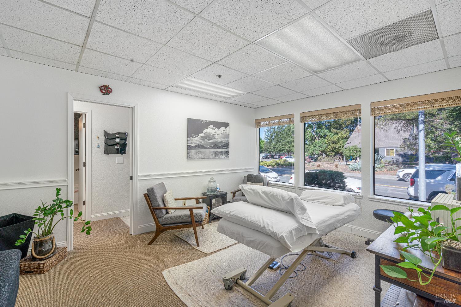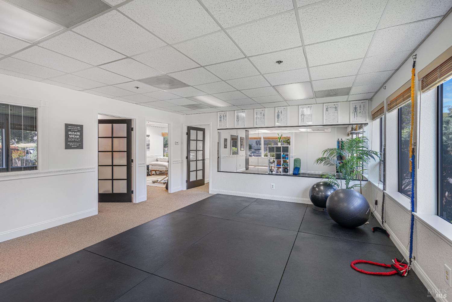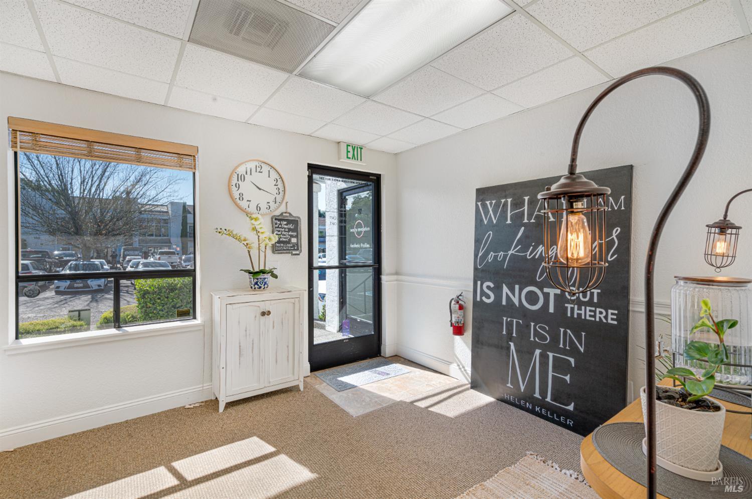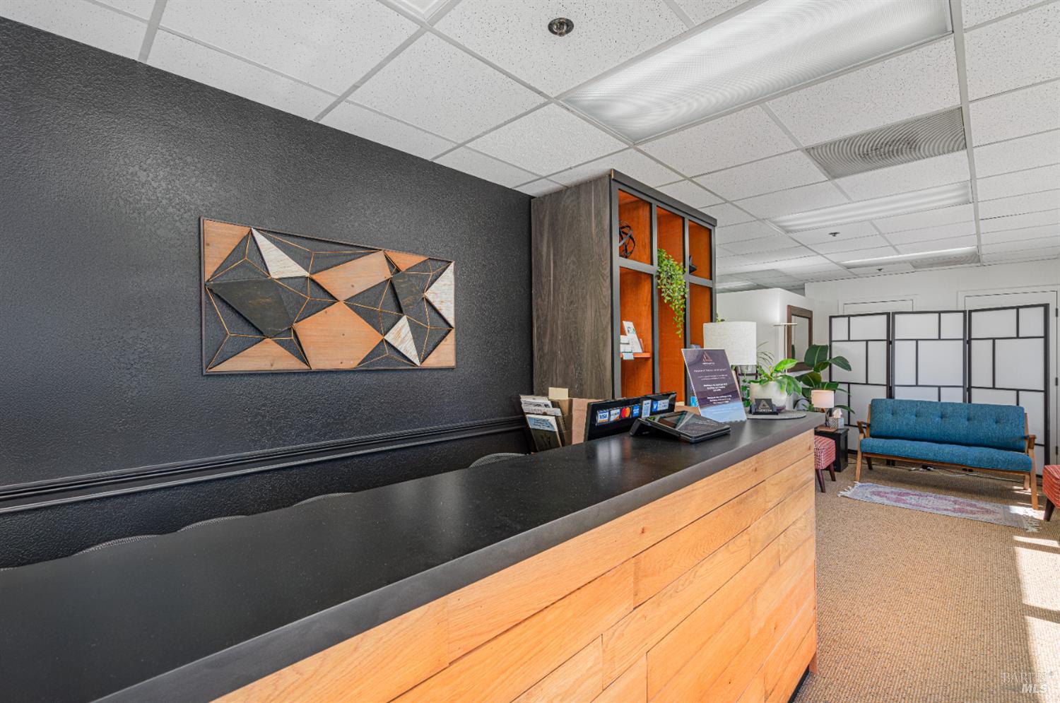 Well-designed and highly versatile commercial space offering a modern, turnkey buildout ideally suited for a wide variety of medical uses or professional office use. Located in the highly desirable Wikiup Professional / Larkfield corridor, the property benefits from a peaceful, professional setting with convenient access to Highway 101, Windsor, and the Sonoma County Airport area. The space features a welcoming reception area with a custom front desk, creating a polished first impression for clients and guests. Large windows line the perimeter, filling the interior with abundant natural light and enhancing the bright, open atmosphere throughout. The flexible floor plan includes a spacious open studio area, well-suited for fitness training and a variety of medical wellness-based uses. Additional features include three private rooms, two bathrooms, and a kitchenette, providing excellent functionality. Thoughtful finishes and an efficient layout make this a true turnkey opportunity for users seeking a professional, client-ready environment. The surrounding Wikiup business park is home to a mix of professional offices, medical and wellness practices, creating a strong, established commercial environment with consistent daytime activity and a well-balanced professional tenant base.